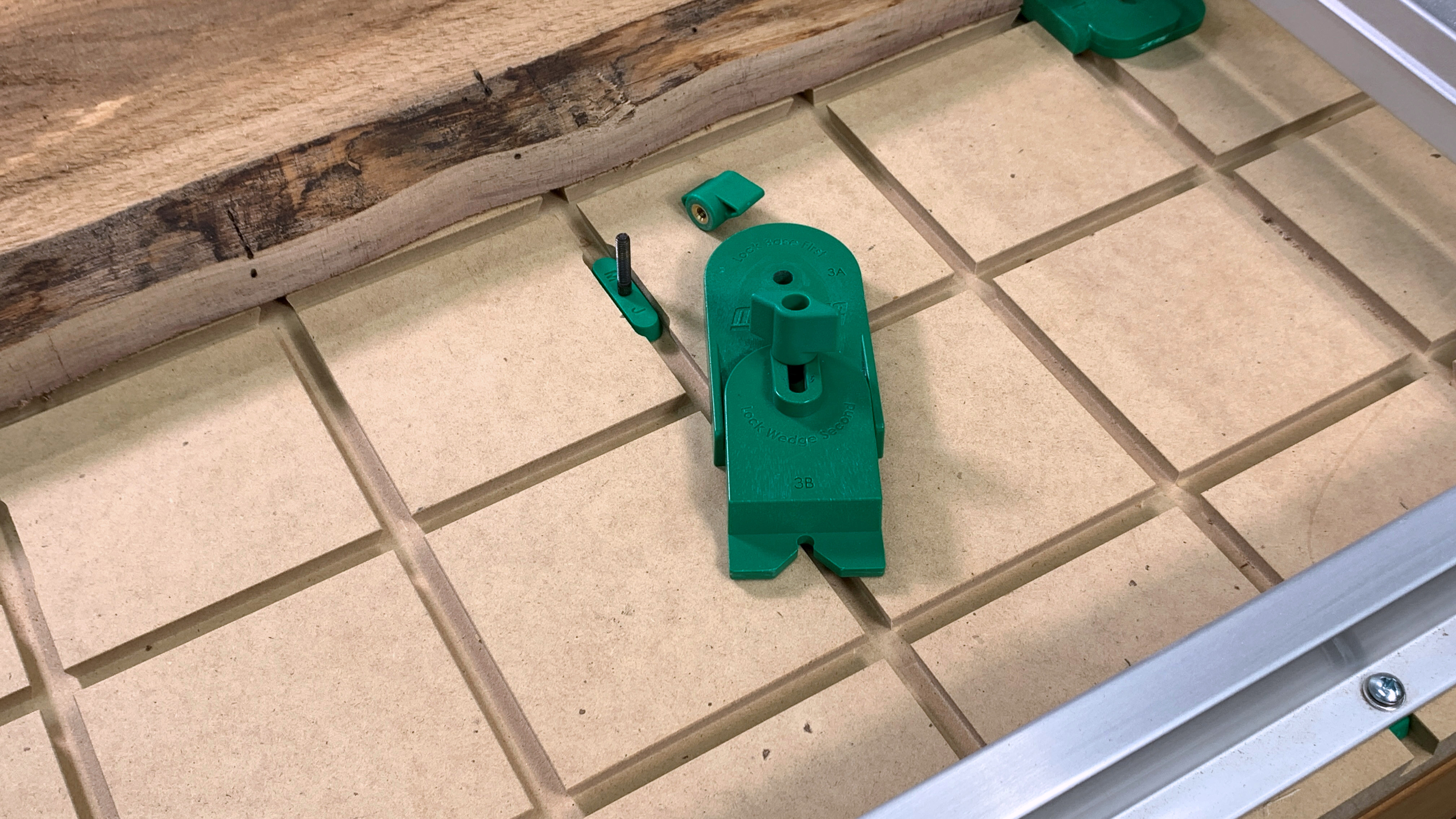 The slots were staggered side to side again to maximize the flexibility of the system. If an odd shaped part means one slot is where you need the hardware to go, you can switch to another on either side. These access slots work well in this situation but are not limited to slab flattening jigs. Many CNC machines also have their axis rails mounted to the spoilboard, crosscut sleds with fences on both ends, and large Grid Tables can all benefit from a few small slots in strategic locations.