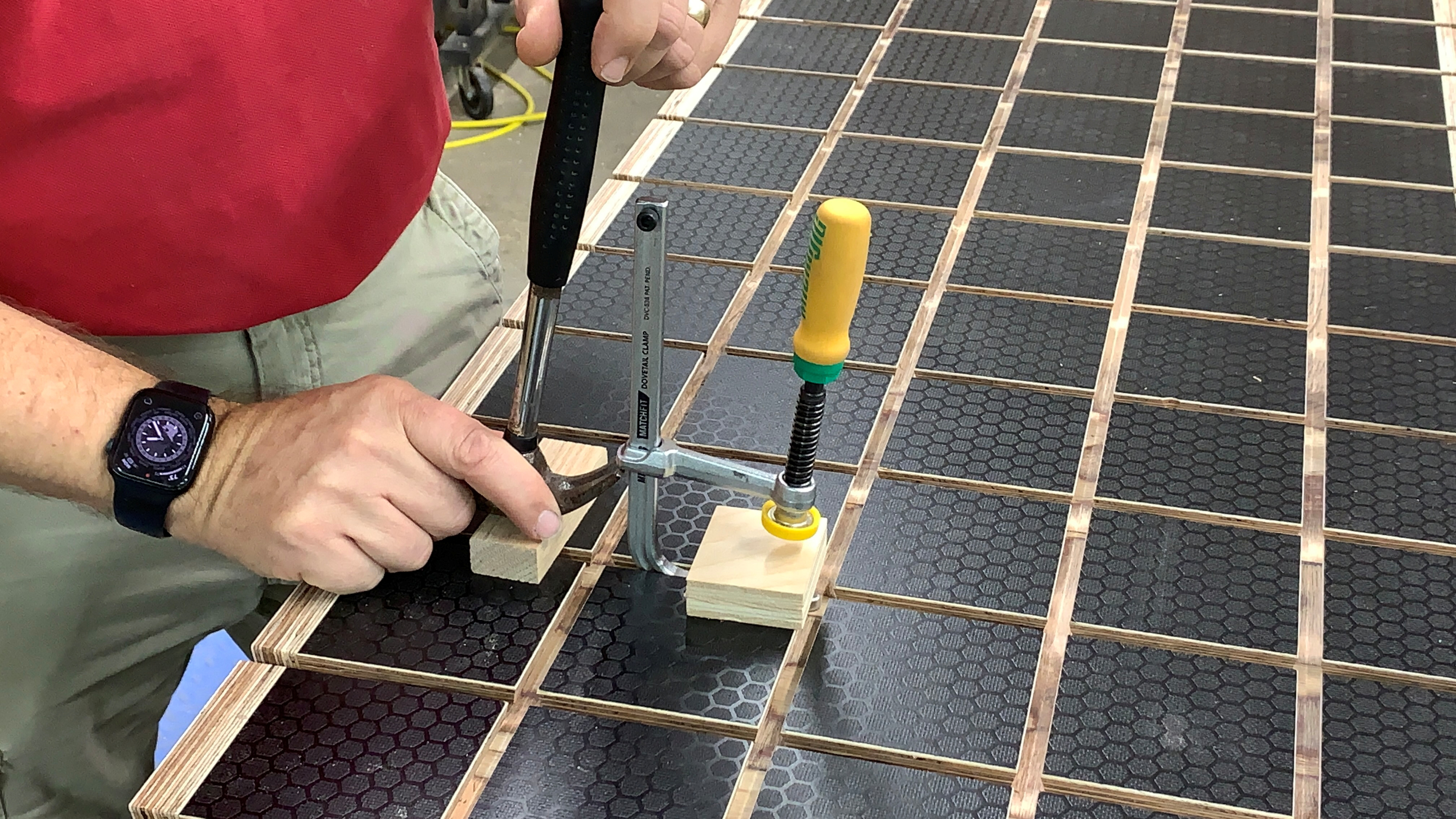 To prevent this binding in the future, always leave a few of the acme threads on your clamps below the arm. This will provide enough clearance to let the arm release. This trick will work with all F-Style clamps. You may be able to rap on the bar with a block of hardwood or pry it as shown here.