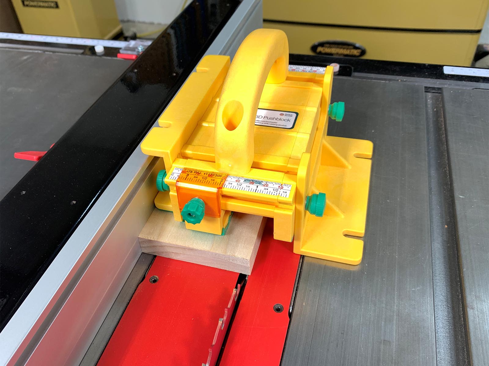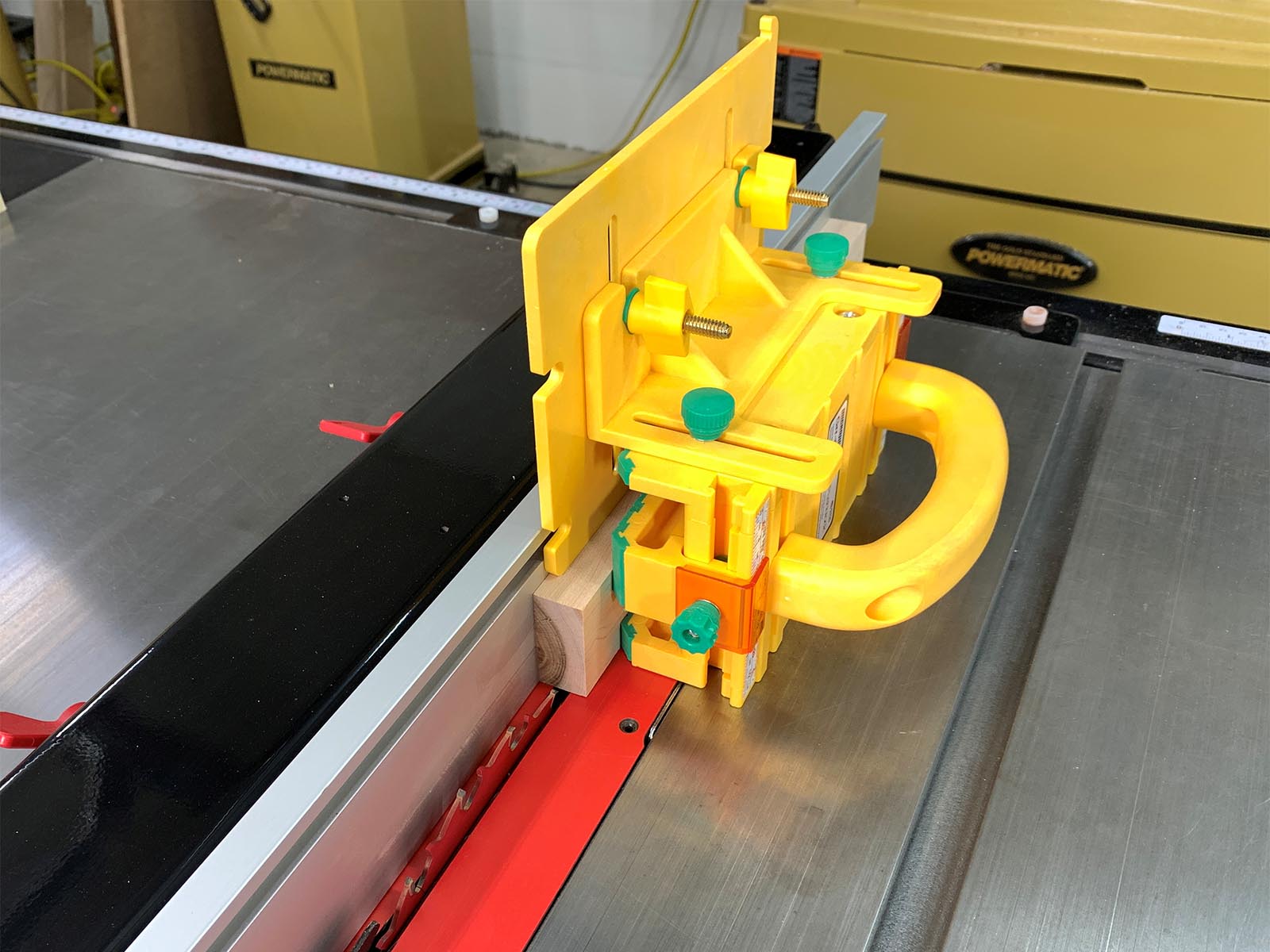 The center leg on every GRR-RIPPER can be moved side to side to avoid contacting the blade no matter what width rip you need to cut, and the SafeRip Index lets you set the Center Leg so you never cut it. But depending on the GRR-RIPPER setup, when the rip cut is somewhere between 3” (75mm) and 3-1/2” (90mm), the outside leg may be in the blade path, and it is not adjustable.