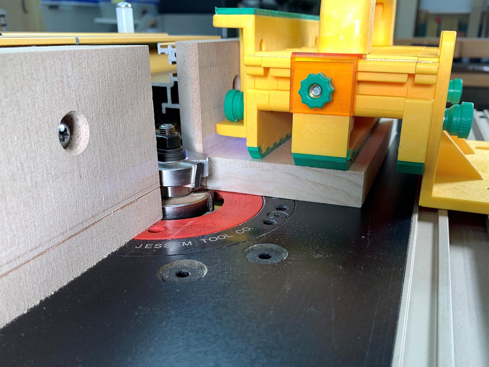 The Adjustable Spacer can also be employed at the router table. By mounting it with the Green Grip facing up and as high on the GRR-RIPPER as possible, it creates a tunnel along the fence. This is highly useful for cuts where the bit may be above the stock and extends beyond the fence face such as bullnose bits or tongue cutters. The exposed section of the bit passes below the Adjustable Spacer without cutting into your GRR-RIPPER leg. These are just two common uses for the Adjustable Spacer, you will likely find more as you use it.